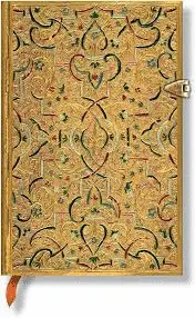 La portada del diario Paperblanks Gold Inlay reproduce un diseño Stil der Neorenaissance (estilo neorrenacentista) popular en la Alemania del siglo XIX. La encuadernación original, compuesta de metal sólido, estaba cubierta por una fina capa de oro que luego fue grabada meticulosamente por expertos artesanos. Encuadernaciones como ésta eran muy valoradas y frecuentemente estaban adornadas con seda, esmaltes cloisonn o piedras preciosas.